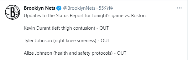 此前杜兰特在比赛中撞伤大腿,因伤连续缺席三场比赛;哈登因腿筋伤势复发同样继续缺席,杜登两大巨头又同时缺阵,篮网对阵凯尔特人的重担又落在欧文肩上。