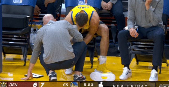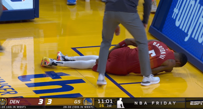 360直播吧讯 北京时间4月24日,勇士和掘金比赛中,比赛仅仅只打59秒,场上发生意外伤病事件,掘金主力球员巴顿受伤倒地不起,捂着大腿十分痛苦,掘金队医赶紧冲过来;随后巴顿一瘸一拐走回更衣室;没过多久,库里也受伤离场。