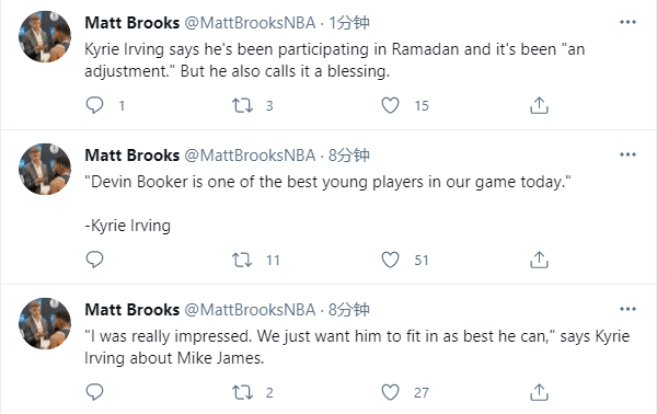 篮网赢球赛后,欧文希望新援迈克-詹姆斯能尽快适应球队,也盛赞布克是当今联盟最好的年轻球员之一;欧文也透露自己的一个生活习惯,这应该也是欧文19投4中狂打铁的一大原因。