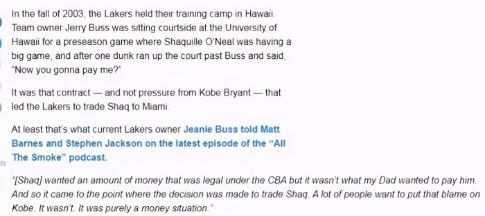 360直播吧讯 北京时间4月23日,湖人老板珍妮巴斯参与栏目时谈到了球队当年交易走奥尼尔一事。珍妮表示:“当年奥尼尔希望得到一份大合同,但是我的父亲杰里巴斯不想给他那么多钱,所以球队就决定交易奥尼尔。很多人将此事归咎于科比,但事实并非这样,纯粹是因为钱。”