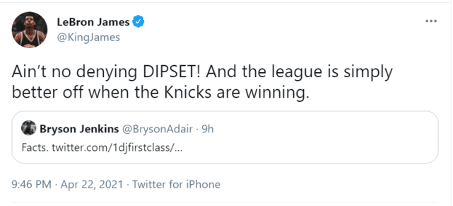 360直播吧讯 北京时间4月23日,湖人球星勒布朗-詹姆斯更新社媒,转发了美国说唱团体Dipset在尼克斯主场的一段说唱,并写道:“不可否认,尼克斯赢球让联盟变得更好。”尼克斯目前已经拿下8连胜,以33胜27负的战绩排名东部第四,8连胜中包括以111-96的比分主场击败湖人。