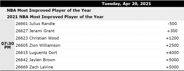 兰德尔是最可能斩获这一奖项的球员,他不但数据提升够大,而且本赛季入选了全明星阵容。他的当选赔率是-500,领先优势也很明显,排名第二的是活塞的格兰特(+300)。
