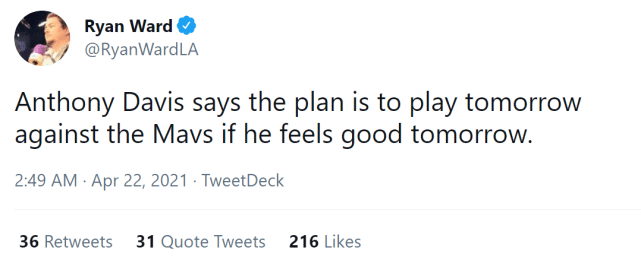 360直播吧讯北京时间4月22日,湖人队安排了一次球队训练,备战明天客场对独行侠的比赛。安东尼-戴维斯在训练后的采访中表示,只要他的右腿对这次训练的感觉良好,他就会在明天对独行侠的比赛中复出!浓眉已经因伤缺席9周,累计30场比赛,在这30场比赛中,湖人14胜16负。
