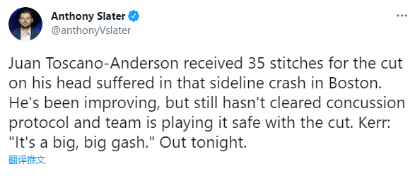 360直播吧讯此前勇士和凯尔特人比赛中,勇士悍将托斯卡诺-安德森拼命救球,摔进技术台撞伤脑袋,头部裹着毛巾返回更衣室,安德森这一拼搏精神令人动容;不久前,勇士主教练科尔透露,安德森的脑袋上有一个很大、很大的伤口,缝了35针。