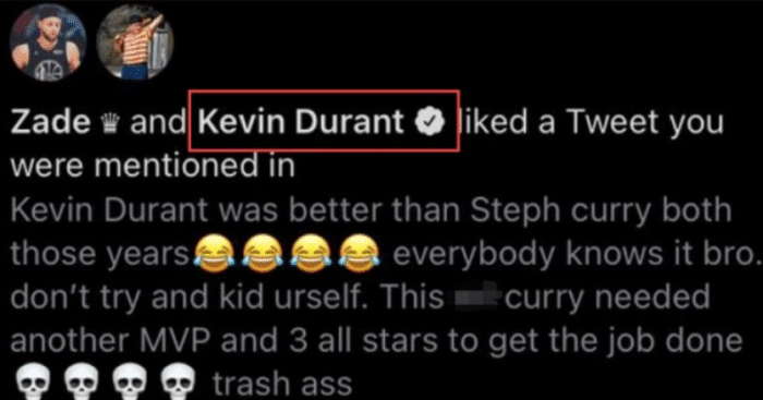 在无意中看到这条动态后,耿直的杜兰特点赞,支持该球迷的看法,非常秀的操作,难怪网友经常用“这该死的气质”形容杜兰特。或许可以这么认为杜兰特在潜意识里,就绝对在勇士夺冠那两年,他是比库里更好的球员。