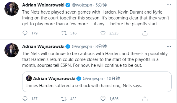 360直播吧讯 篮网官宣坏消息,哈登在训练中遭遇不幸,腿筋拉伤的伤势复发,被列为无限期缺阵,没有复出时间表;ESPN名记透露哈登最快也要到季后赛前才能复出;杜兰特伤停,哈登伤势复发,篮网的冲冠赛季真是太难了,就连劳模哈登也惨遭伤病的侵袭。