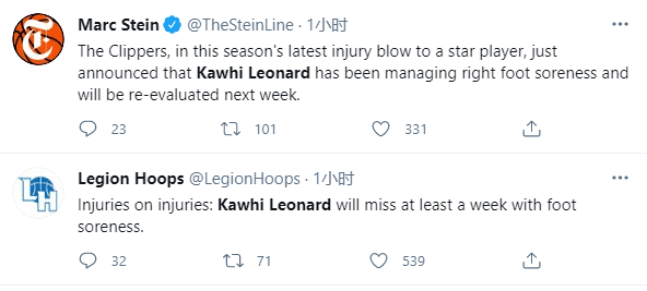 360直播吧讯 NBA伤病不断,篮网官宣哈登腿筋伤势复发,无限期缺阵之后,快船当家球星小卡也伤停,快船官方宣布,小卡莱昂纳德右脚酸痛,将在一周后复查伤势;此前小卡因右脚伤势连续缺席了4场比赛;复出仅打一场,小卡又至少伤停一周。