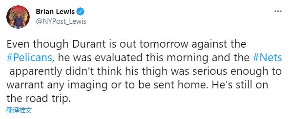 名记Marc Stein赛前报道了篮网的最新伤情。明日与鹈鹕比赛球队将会有7人缺阵,杜兰特是因为大腿挫伤,据篮网记者Brian爆料杜兰特伤情不重,不需要进行任何成像检查,他可以随队出征客场比赛,但保守起见,球队会把他列为每日观察状态!