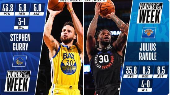 上周兰德尔场均35.8分8.3篮板6.5助攻,而库里则是43.8分5.8篮板5.0助攻,这是他本赛季第二次当选,生涯第16次,而且这段时间打出了疯狂的比赛!上周合计投进36个三分超越了5支球队投进的还多,职业生涯3次赛季场均至少投进5个三分历史唯一一人,崴脚受伤坚强作战,让人叹服!