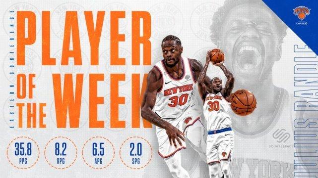 兰德尔上周场均贡献35.8分8.3篮板6.5助攻,率领尼克斯打出4胜0负的佳绩。这是兰德尔生涯第一次当选周最佳。对于尼克斯而言,这是一个久违的球员奖项,上一次尼克斯有球员当选周最佳,已经要追溯到2017年的波尔津吉斯。