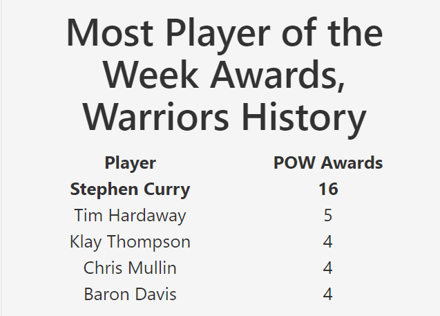 这一周,他的命中率也相当惊人,投篮命中率57.3%,三分命中率54.5%,罚球命中率90.6%。他已经连续10场比赛得分30+,这不但是生涯最佳,而且追平科比,成为历史上第二位33岁及以上还能做到这一点的球员。库里这次当选周最佳,是勇士队史上第54次有球员获此殊荣,其中库里16次,遥遥领先,排名第二的是蒂姆-哈达威(5次),汤普森、穆林和戴维斯分别当选过4次。