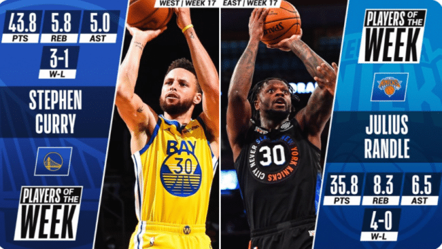 360直播吧讯 北京时间4月20日,NBA官方宣布了上周的东西部周最佳球员。西部周最佳属于勇士后卫斯蒂芬-库里,东部周最佳属于尼克斯前锋朱利叶斯-兰德尔。