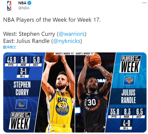 360直播吧讯 北京时间4月20日,NBA联盟官宣本赛季第17周东西部周最佳球员,尼克斯球星兰德尔首夺东部最佳,上周场均35.8分83篮板6.5助攻,带队4胜0负,已成纽约新王;勇士球星库里再次当选,场均狂砍43.8分太疯狂,当选西部周最佳真乃实至名归。