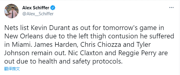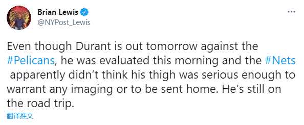 篮网记者Brian Lewis报道杜兰特最新伤情,尽管杜兰特将在明天缺席与鹈鹕的比赛,但他今天早上接受了评估,篮网队认为他的大腿伤势并不严重,不需要进行任何成像检查或把他送回家,杜兰特继续随队出征客场;这足以说明杜兰特伤势无大碍。