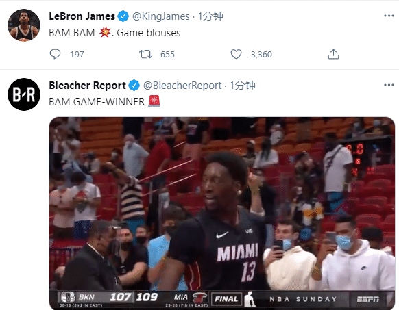美媒《露天看台》转发阿德巴约绝杀的画面,并且发推写道:阿德巴约终结比赛;热火官方连续更新动态,疯狂庆祝胜利,其中一条写着:我们知道阿德巴约会让某个人为他感到骄傲。