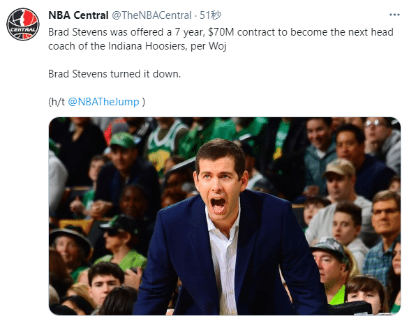 360直播吧讯北京时间4月18日,据ESPN名记沃纳罗斯基报道,凯尔特人主帅布拉德-史蒂文斯拒绝了一份来自印第安纳大学7年7000万美元的主教练合同;少帅拒绝7年7000万美元大合同,年薪高达千万美元,目前史蒂文斯年薪不详,去年他和球队达成提前续约合同。