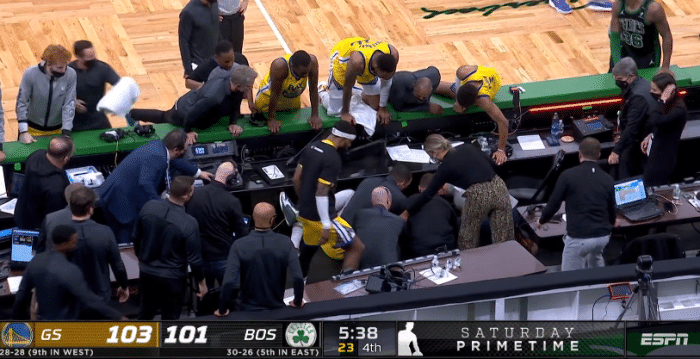 360直播吧讯北京时间4月18日,勇士和凯尔特人比赛中,末节场上连续发生意外事件,勇士球星安德森拼命救球,从技术台桌子上翻越过去,奋不顾身直接摔倒在场边,撞翻场边的物品,倒地不起,勇士众队友围过来,最终安德森用毛巾捂着头离场。
