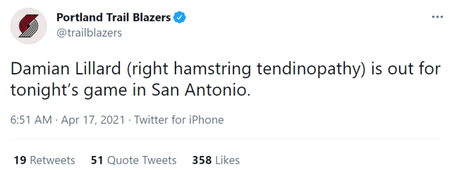 360直播吧讯 北京时间4月17日,开拓者官方宣布,达米恩-利拉德缺席客场对马刺的比赛,原因是他的右腿筋出现炎症!又是腿筋伤势,继杜兰特和哈登之后,利拉德成为了又一位腿筋受伤的全明星。除了他们三位,森林狼的马利克-比斯利、国王的霍姆斯也都遭遇了腿筋的伤势而休战。