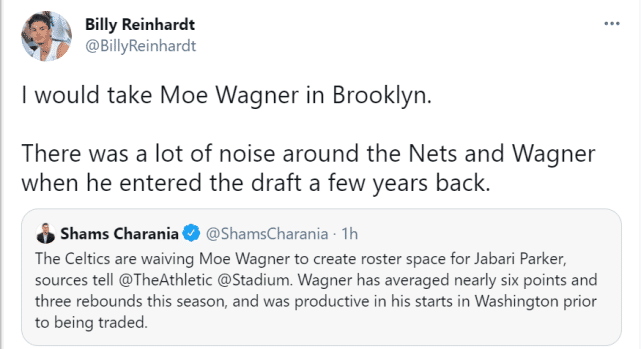 360直播吧讯 北京时间4月17日,凯尔特人用两年合同签下贾巴里-帕克,为了给帕克腾出位置,他们裁掉了23岁中锋莫里茨-瓦格纳。篮网跟队名记Billy Reinhardt更新社媒写道:“应该把瓦格纳带到布鲁克林来。几年前,当他参加选秀的时候,篮网就和他传出不少流言。”