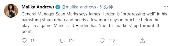 篮网总经理肖恩-马克思透露哈登的伤病康复得很好,他想尽早复出;不过在复出之前,他还需要几天的时间来训练并提升自己的状态,如果一切顺利的话,哈登将会复出和队友们一起参加比赛。