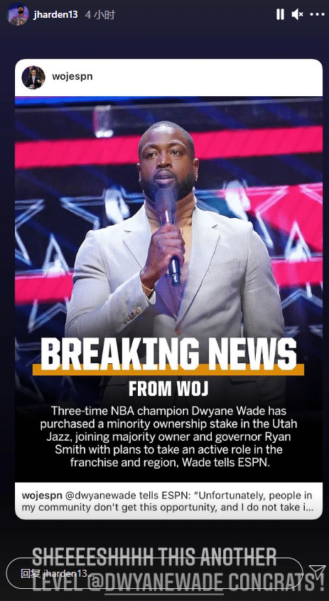 另外要说的是哈登更新社媒媒体,恭喜韦德成为爵士队小老板,写道:恭喜,这是另外一个层次!