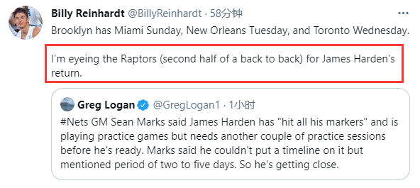 此前哈登遭遇腿筋拉伤,因伤连续缺席5场比赛,如今哈登复出将近,已经参加队内训练,预计很快就能伤愈复出,篮网记者Billy Reinhardt报道,预计哈登将在对阵猛龙时复出,大概就是再过5天的样子。