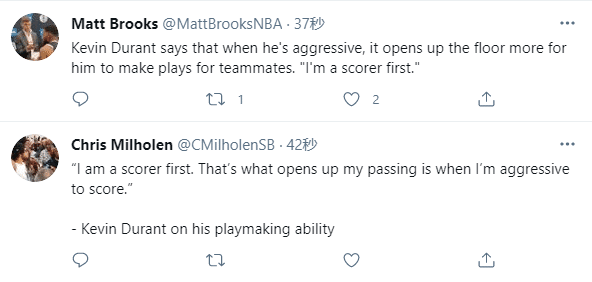 赛后杜兰特接受采访,谈到本场扮演的角色,杜兰特表示他根据节奏、和防守人之间的距离等元素来决定进攻,直言:首先我是一名得分手,当我打出侵略性时,我能够创造更多的传球机会。