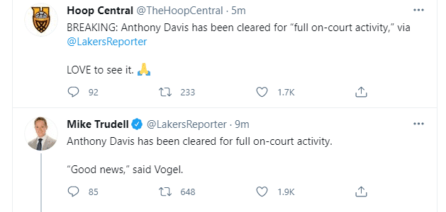 按照赛程安排,16日打完与凯尔特人的比赛后,湖人会在18日和20日连续对阵联盟第一的爵士,浓眉可能复出,这对湖人来说也是好消息。不过沃格尔同时确认,浓眉复出后会有15分钟的时间限制,逐步恢复到比赛的水准。