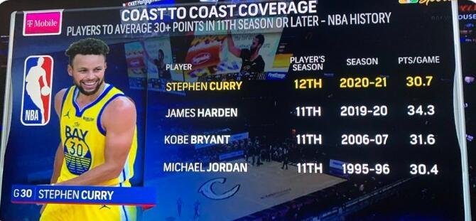 过去三场比赛他一共拿下了128分,目前场均得分已经来到了30.7分!今日美媒晒出数据,NBA历史中只有4名球员能够在个人效力第11个或以上赛季里场均至少得到30分,除了库里外分别是乔丹和科比哈登,本赛季的库里非常有可能拿到三分王+得分王,比尔有可能被超越!