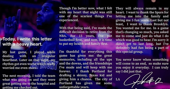 360直播吧讯 阿尔德里奇突然宣布退役的消息震惊NBA和球迷们,才离开马刺,来到篮网不久的前NBA全明星球员阿德在社交媒体上发布告别信,宣布自己正式退役。阿德称在11日输给湖人的比赛中,他心律不齐:“尽管我现在已经好多了,但那天晚上发生的事情是我经历过的最恐怖的事情之一,是时候把健康和家庭放在第一位了”。出于健康层面的考虑,阿德宣布退役。