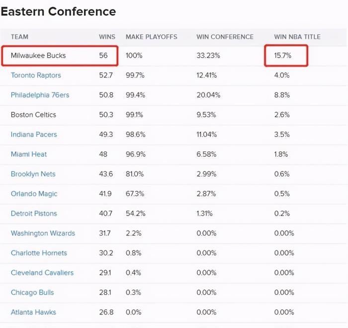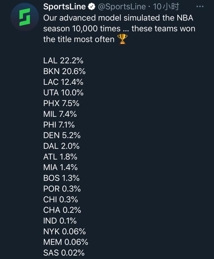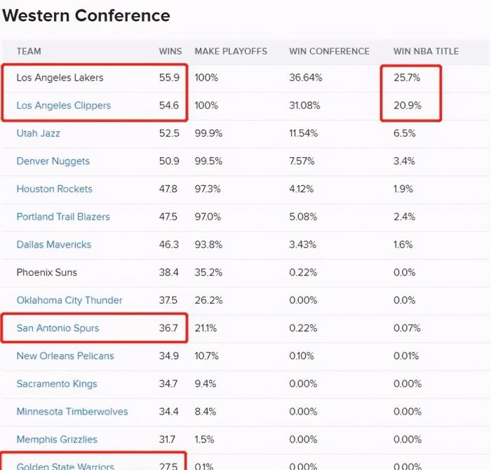 这篇数据是基于他们的进阶数学模型,并且推演模拟了一万遍而得到的结果,而早在2019-2020赛季前两周,sportsline就已经成功预测当赛季常规赛的东西部冠军,而对于本次的数据推演,还是有不错的参考性。