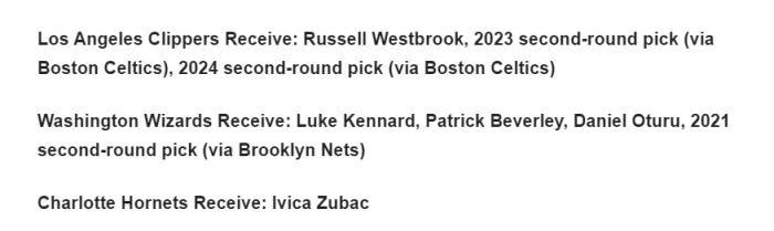 奇才送出威少和2021年次轮选秀权(来自篮网),得到黄蜂送出的2021年次轮选秀权(来自绿军)和2024年次轮选秀权(来自绿军);