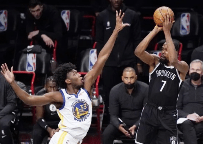 而杜兰特是四届得分王,MVP和总冠军得主,被誉为“死神”。杜兰特的优势在于,他拥有中锋的身高,手感却像后卫般柔和,不管是打后卫还是前锋,几乎都是错位。2017年和2018年总决赛,杜兰特连续在詹姆斯头上命中3分球,足以看出他的关键球能力有多强,几乎是无解的存在。
