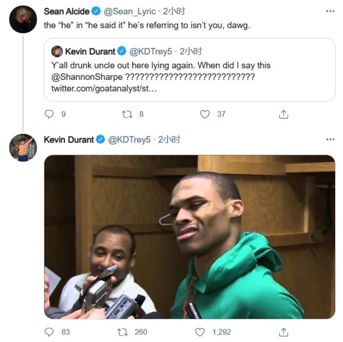 在近日的《毋庸置疑》节目中,名嘴Shannon Sharpe谈到了杜兰特“因为他(指杜兰特)说过:‘如果说詹姆斯是GOAT,那么击败了他两次、在他的主场投进了那个球,那我会是什么?’”这引起了杜兰特的不满,他直接转发了相关新闻,并且晒出了好兄弟威少的表情包附文回击!