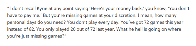 欧文不打球还能拿钱?史密斯看不下去了。他在节目中说道:我不记得欧文在任何时候说过‘这是你们的钱,拿回去吧,你们不用付我工资了‘,但你在自作主张缺席比赛。“这个赛季只有72场,而不是82场,上赛季你就只打了20场,你不打球到底想怎样?”