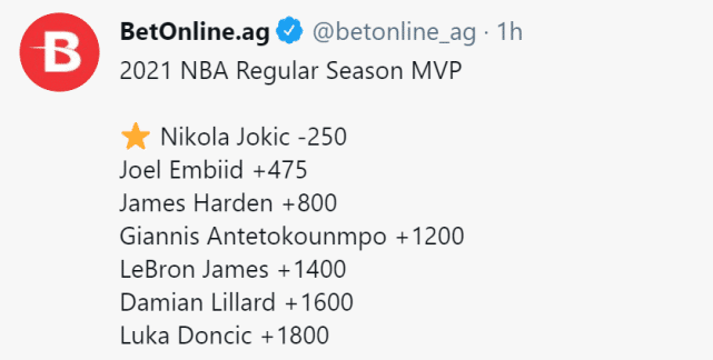 360直播吧4月13日讯 北京时间4月13日,2021年常规赛MVP的最新赔率出炉,约基奇(-250)继续领跑,而且扩大了领先优势。恩比德(+475)排名第二,哈登(+800)位居第三。排名第4-7位的依次是字母哥(+1200)、詹姆斯(+1400)、利拉德(+1600)和东契奇(+1800)。