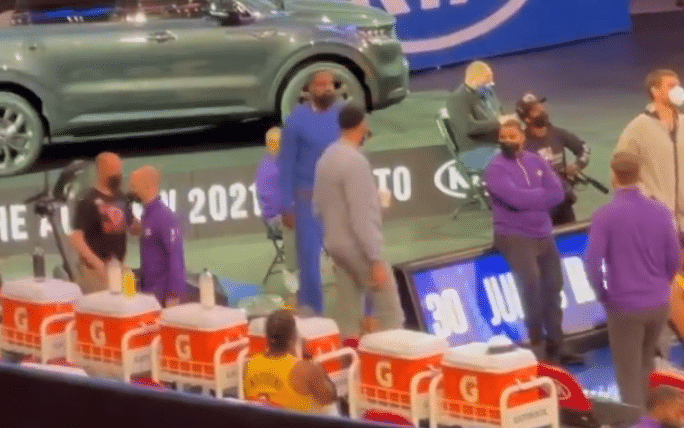360直播吧4月13日讯 今天湖人对阵尼克斯,詹眉组合依旧缺阵,据悉两人复出的时间已经很近了,不过他们依旧需要好好的养伤和调整状态,无缘本场比赛。今天的比赛也很激烈,比分没有被拉开,但镜头给到场边的时候,我们发现不断运球、与浓眉哥一起探讨的詹姆斯,很显然詹皇这是按捺不住了。
