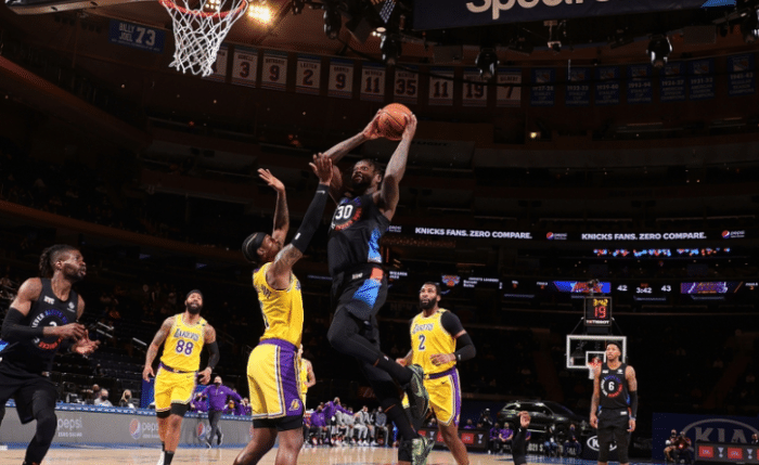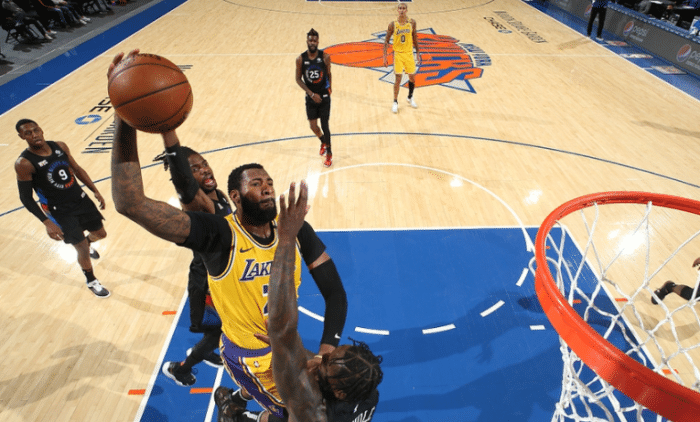 360直播吧4月13日讯 今天NBA常规赛结束了一场焦点战,湖人客场96-111不敌尼克斯吃到败仗。这场比赛詹姆斯和浓眉哥依旧缺席,庄神德拉蒙德拿下3分10板1断1帽的数据,整体的表现相对一般,而且在比赛中他的篮下防守不到位,失误也偏多。