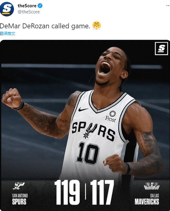 360直播吧讯马刺119-117险胜独行侠,德罗赞全场上场34分钟25投13中轰下33分8助攻5篮板,终场前0.5秒极限中投绝杀,德罗赞绝杀独行侠冲上热搜引热议,马刺官方连续更新动态,发推写乱码疯狂庆祝,马刺名宿吉诺比利也口出乱码,为德罗赞绝杀而疯狂庆祝。