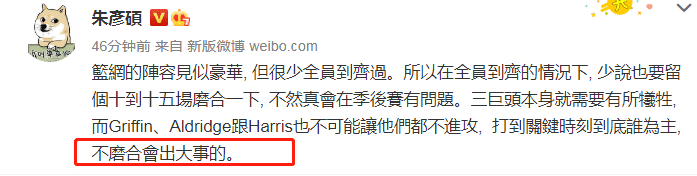 而朱彦硕老师则认为篮网还需要磨合。“篮网的阵容看似豪华,但很少全员到齐过。所以在全员到齐的情况下,至少需要10场到15场磨合以下,不会真会在季后赛出现问题”。