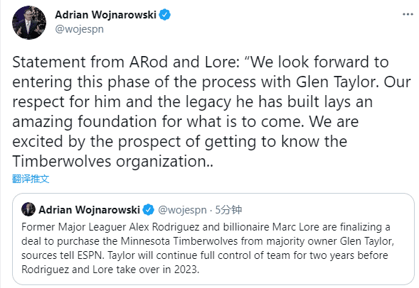 360直播吧讯明尼苏达森林狼就要被卖掉了,据ESPN名记沃纳罗斯基报道,三届MLB的MVP得主罗德里格斯和电子商务巨头马克-洛尔已经与森林狼老板格伦-泰勒签下一份意向书,二人斥资15亿美元将接替泰勒成为森林狼的新老板。