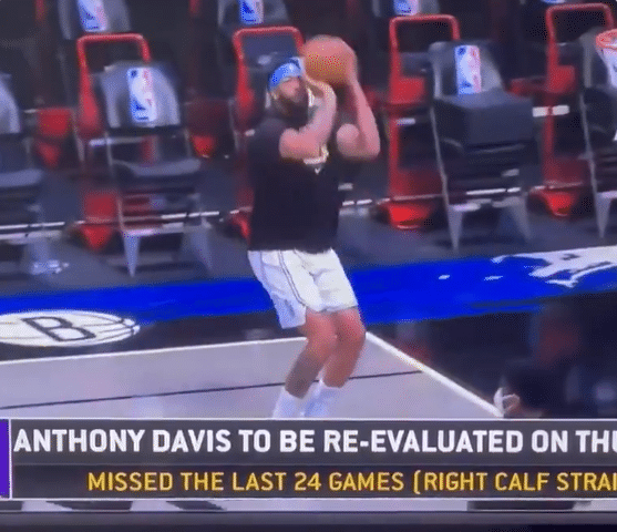 浓眉身穿湖人训练服和白色短裤,头戴蓝色发带十分抢镜,在篮网主场巴克莱中心球馆训练,接球跳投轻松命中,每一次投篮都是跳投;在球场上蹦蹦跳跳,已经摆脱小腿伤势的困扰,而且投篮手感不错,甚至出手后提前转身。
