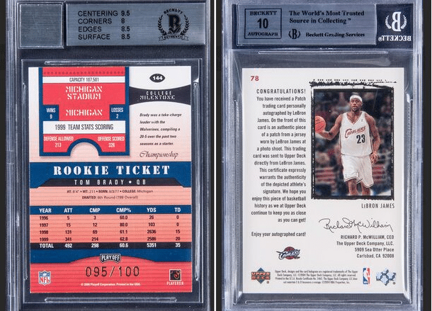 据悉这次和詹姆斯新秀卡一起拍卖的还有NFL传奇球星汤姆-布雷迪的新秀卡,这两张珍贵的球星卡的预计成交价都是250万美元,加起来高达500万美元。而詹姆斯的这张球星卡还有不同的意义,它之所以会创造新的纪录,也是和其他的球星卡有很多的不同。