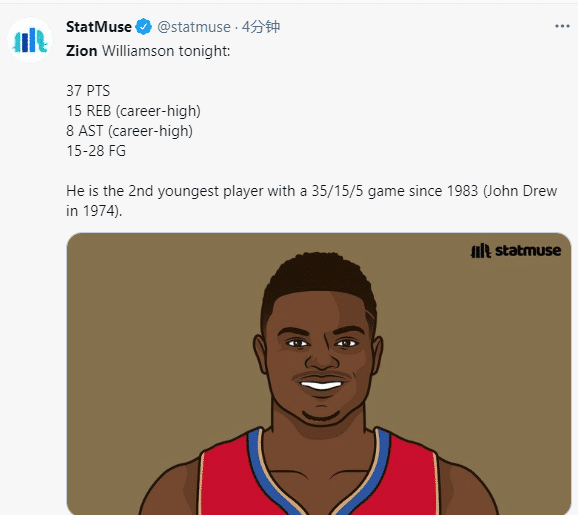 锡安面对东部豪强轰下37分15篮板8助攻带队赢球,20岁锡安成为09年杜兰特之后首位21岁以下轰下35+15的球员,过去30个赛季仅有奥尼尔两次做到;锡安篮板和助攻都创生涯新高,也成为1983年之后NBA历史第二年轻35+15+5的球员。