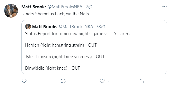 360直播吧4月10日讯 篮网对阵湖人的伤情报告出炉,哈登(右腿筋拉伤)、泰勒-约翰逊(右膝酸痛)和丁威迪(右膝伤势)都缺席比赛,但篮网神射沙梅特已经不在伤病名单撒花姑娘,沙梅特复出对阵湖人;篮网众将将在主场身穿黑色城市版战袍对阵湖人。