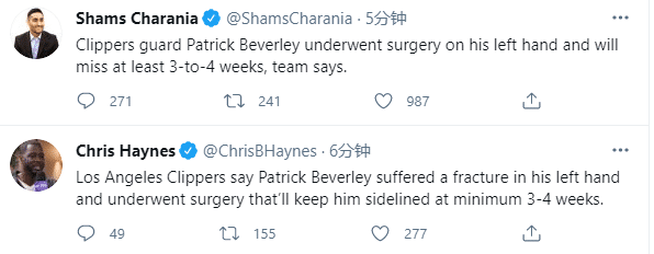 360直播吧讯快船遭重创,快船官方已经宣布,球队后卫帕特里克-贝弗利遭遇左手第四掌骨骨折,已经成功接受手术,因伤至少缺席3-4周,没有具体复出时间表;名记曝光贝弗利受伤真因,貌似也就解释了他为何恶犯肘击保罗,最终被驱逐离场。