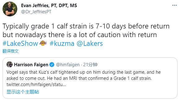 沃格尔表示库兹马遭遇了左小腿一级拉伤“他仍然在那里感觉到巨大的酸痛和紧张感,所以我们今天让他休战。”医学专家表示,这种伤病一般要伤停10天左右,但容易出现反复,所以有可能打打停停要彻底康复需要更久的时间,值得一提的是浓眉已经缺席了24场比赛,两人是同一种伤病,也就是说库兹马很可能缺席很久,甚至常规赛不能打也不是不可能。