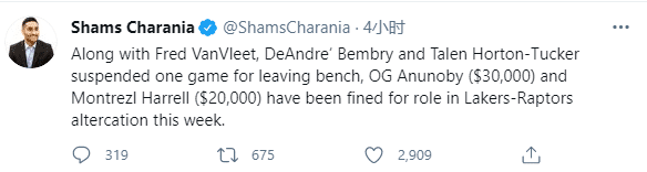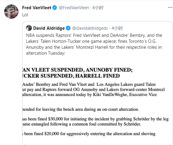 360直播吧4月9日讯此前湖人和猛龙冲突处罚结果,据名记shams报道,阿奴诺比和哈雷尔被联盟追加罚款,合计5万美元;范弗利特、本布里和霍顿-塔克因离开板凳席被禁赛一场;两人被罚款以及三人被禁赛累计损失约17万美元,随后NBA官宣这一处罚结果,猛龙主力范乔丹发推回应此事。