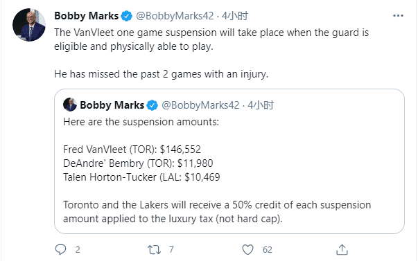 据薪资专家Bobby Marks报道,范弗利特被禁赛一场损失约14.7万美元,本布里一场比赛损失约1.2万美元,霍顿-塔克一场比赛大概损失约1万美元;范乔丹损失最多,三人总计损失约17万美元。