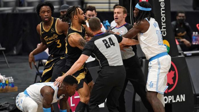 NBA官方宣布湖人和猛龙冲突的处罚结果,声明:猛龙球员本布里、范弗里特以及湖人球员霍顿-塔克因为在冲突期间离开板凳席,而被禁赛一场,但没有罚款。